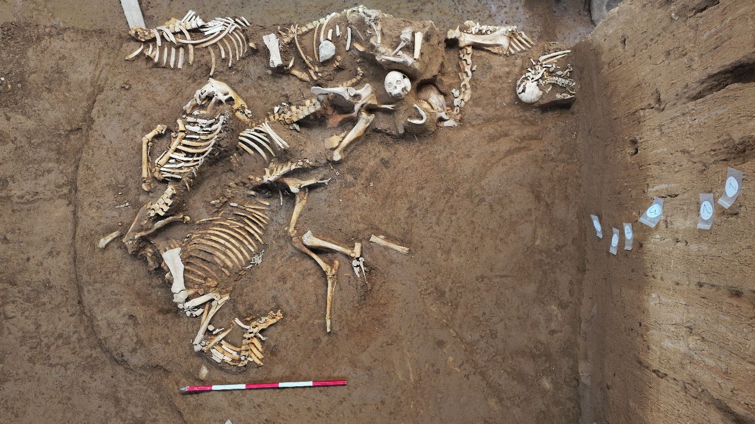 持续至2024年,陕西宝鸡市周原遗址考古队进一步明确,该遗址拥有宫城、小城与大城三座西周城垣,规模之大,彰显着周原遗址的都邑地位。尤其在宫城东南门西侧的壕沟内,发现了200余片卜甲、卜骨残片,初步辨识出刻辞180余字,这是西周甲骨文的又一次重要发现。这些甲骨文,涉及天文历法、历史地理、军事战争等多方面,对解开西周诸多历史谜题有着极高的学术价值。图为2024年8月29日拍摄的周原遗址内的动物遗骨。(图片来源:中新社发陕西省考古研究院供图)