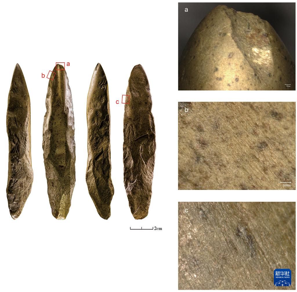 和龙大洞遗址位于吉林省延边朝鲜族自治州和龙市,是一处旧石器时代晚期旷野遗址,年代距今5万至1.5万年。图为吉林和龙市大洞旧石器时代遗址第二阶段出土的局部磨光石器(左)及其微痕特征(拼版照片,资料照片)。(图片来源:新华社)