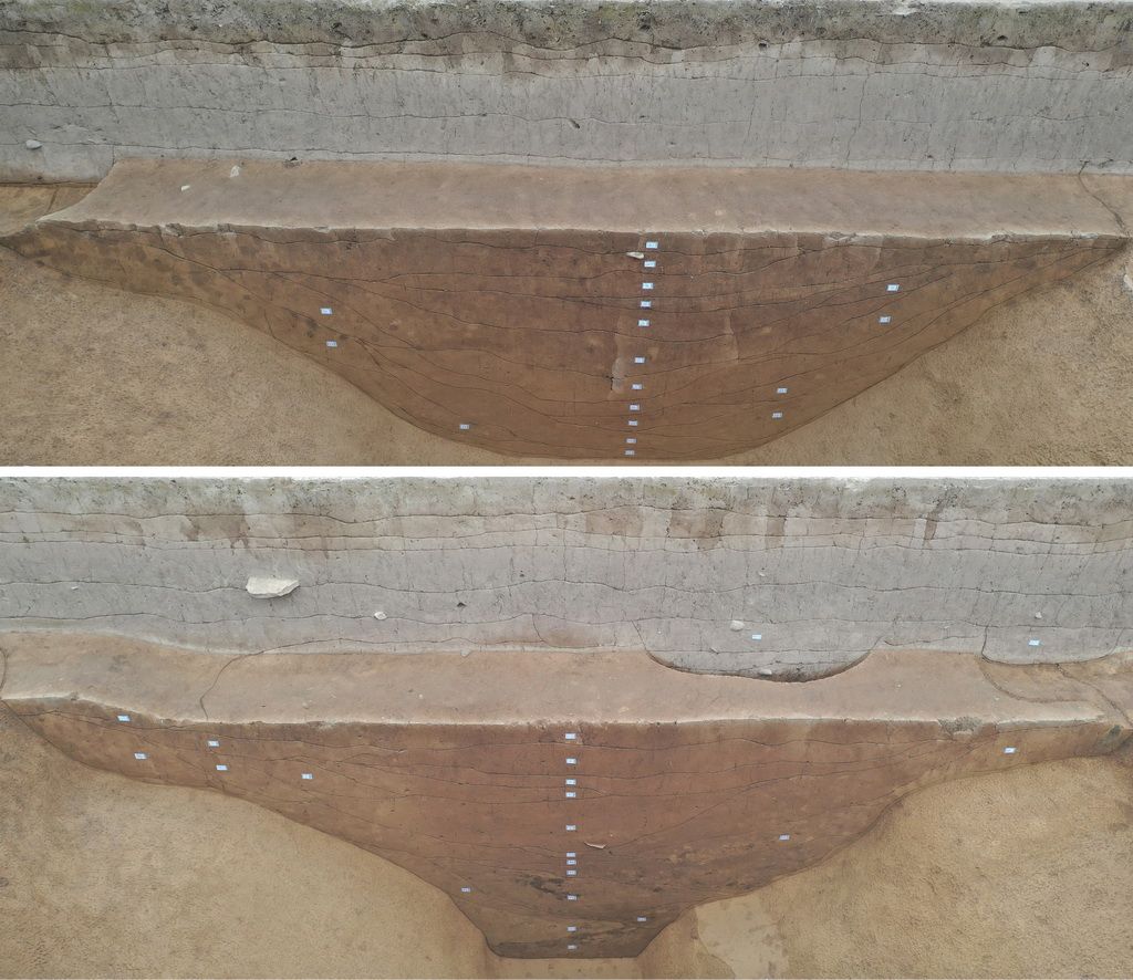 寺洼遗址位于甘肃省定西市临洮县寺洼山村。目前揭露面积近4000平方米,发现并发掘出马家窑文化大型聚落和寺洼文化大型墓地。图为甘肃临洮县寺洼遗址南段东侧“围壕”解剖沟西壁剖面(上为外圈,下为中圈)(资料照片)。(图片来源:新华社)