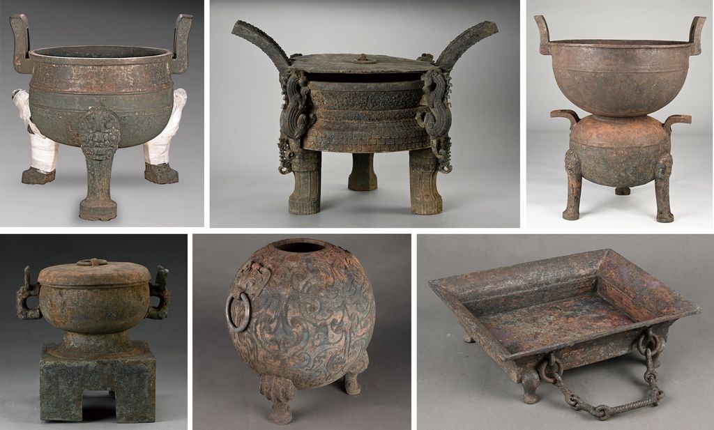 武王墩墓地位于安徽省淮南市高新区三和镇徐洼村武王墩自然村南约150米。经过近五年的考古发掘与近半年的资料整理工作,武王墩一号墓编号文物已过一万件,数量十分庞大,种类包罗万象,为了解楚国物质文明提供了丰富的资料。图为安徽淮南市武王墩战国晚期一号墓出土的铜器(拼版照片,资料照片) 。