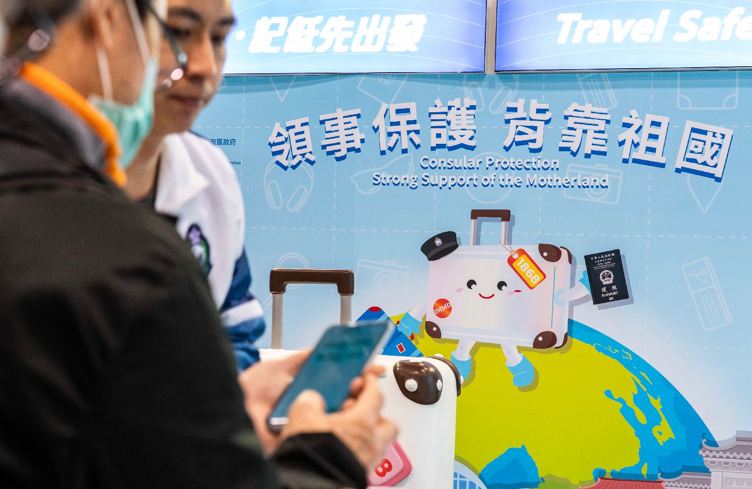 外交部驻香港特别行政区特派员公署和香港特区政府入境事务处设立的领事保护介绍展区吸引参观者咨询。
