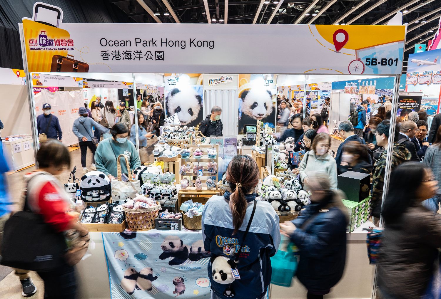 香港海洋公园展位主打大熊猫元素吸引参观者。