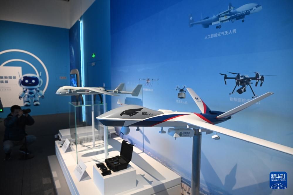 无人机模型在网络发展新图景成就展上展出。(图片来源:新华社)