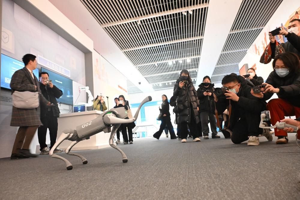 观众20日在网络发展新图景成就展上拍摄一款机器狗。(图片来源:新华社)