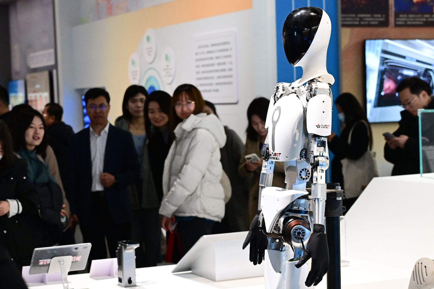 观众在观看展出的人形机器人T1Pro。(图片来源:中新社)