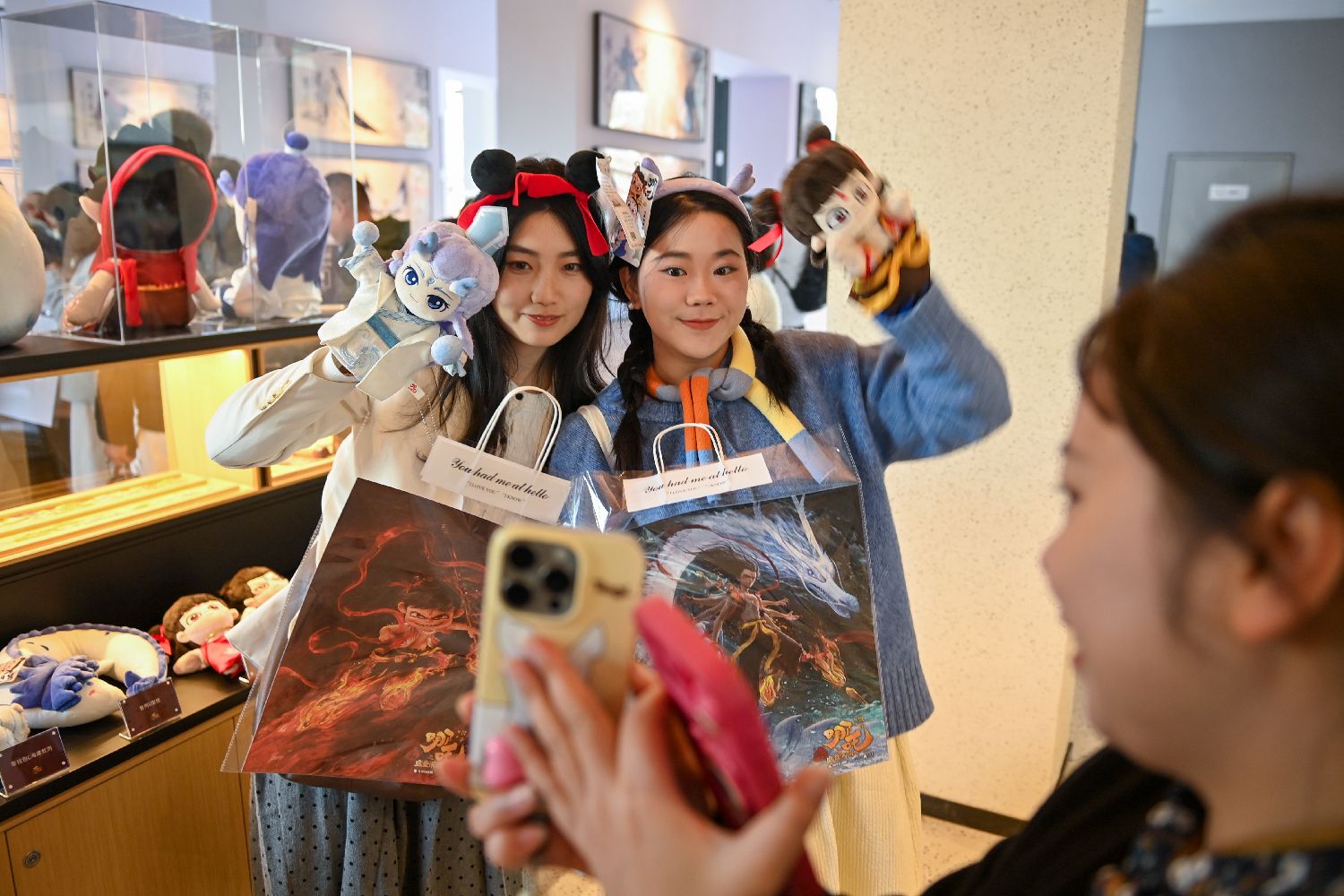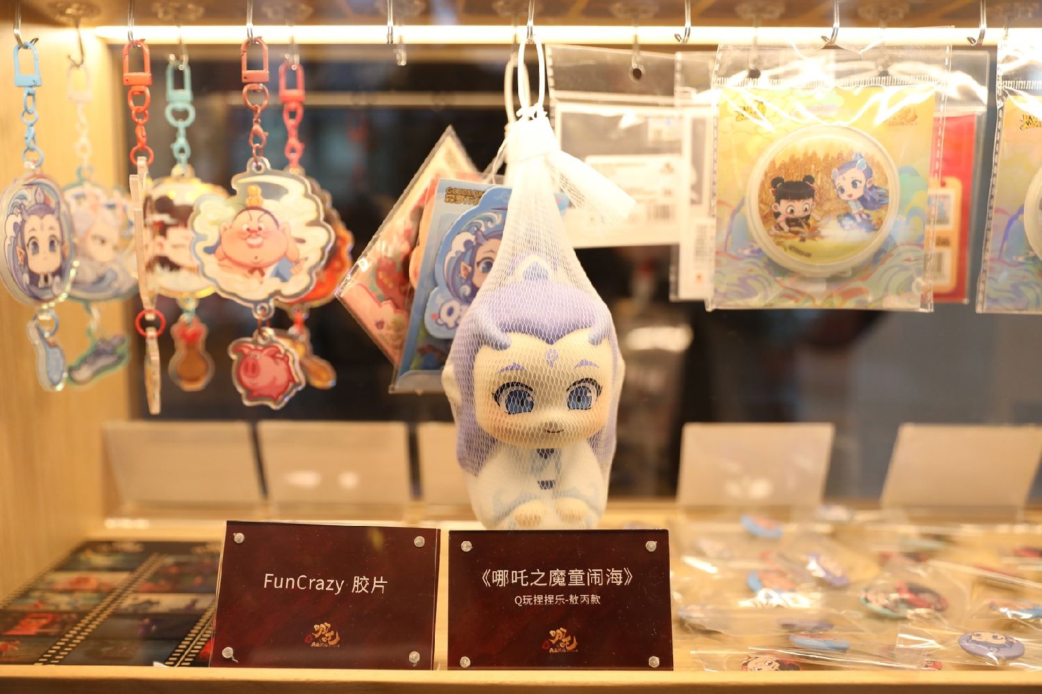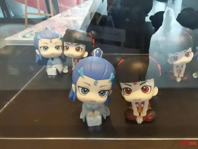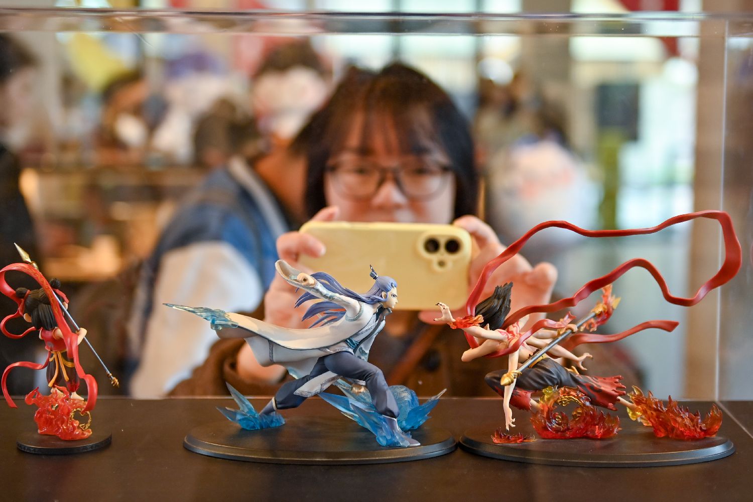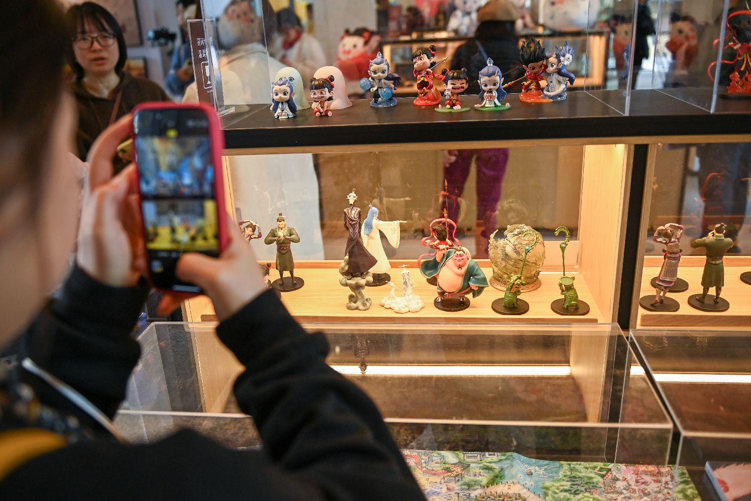 电影《哪吒之魔童闹海》中的人物造型摆件吸引参观者。(图片来源:中新社)