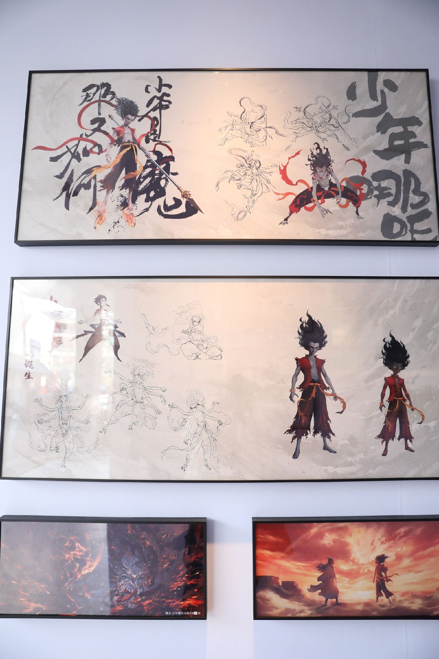 《哪吒2》中的许多角色形象设计,一直被观众津津乐道,比如经历了100多版的“哪吒”、造型灵感来自三星堆的“铁憨憨”结界兽等。图为角色场景设定展示区-哪吒。(图片来源:四川在线)