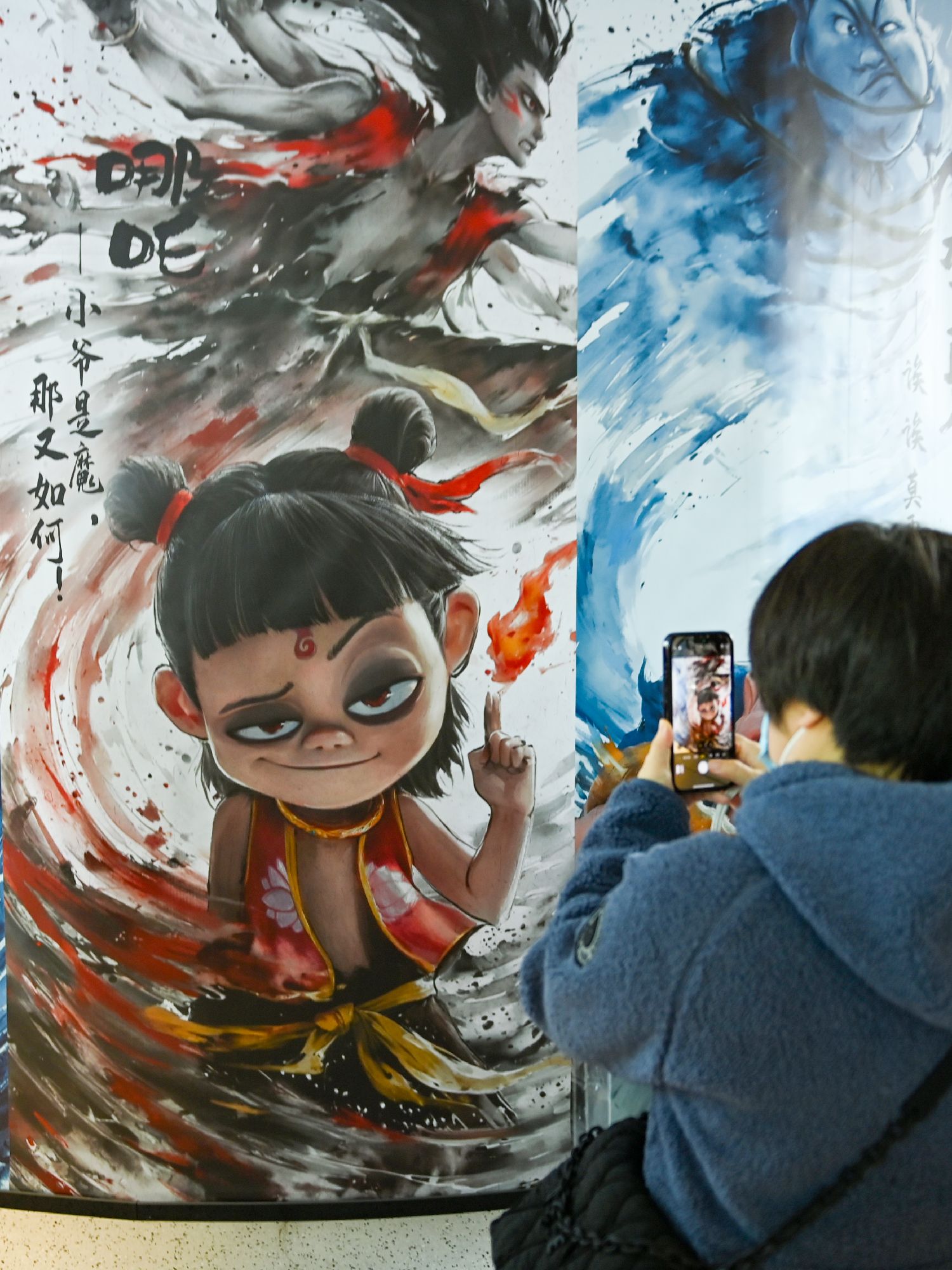 哪吒造型画吸引参观者手机拍照。(图片来源:中新社)