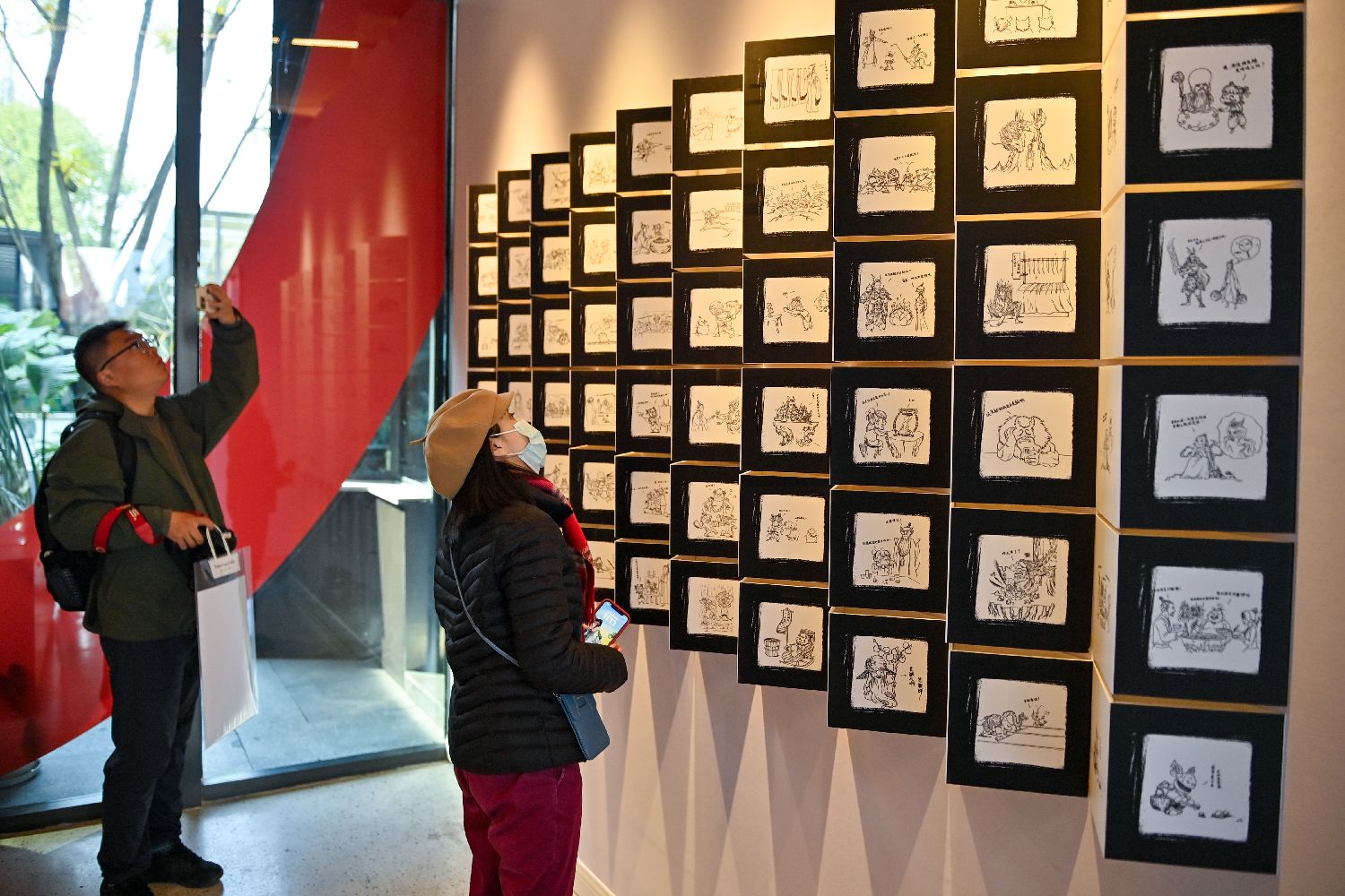 现场展出的创作底稿引参观者驻足。(图片来源:中新社)