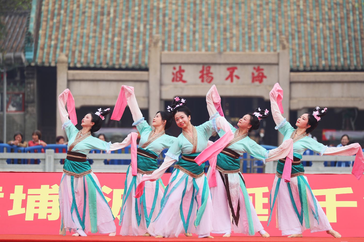 “钟鼓齐鸣·祭海祈福”仪式以盛大的鼓乐与舞蹈拉开序幕,重现古代海祭庄严场景,表达对风调雨顺、国泰民安的祈愿,以现代的方式重现古老传统,再现唐宋时期的恢弘文化。(图片来源:广东南方网)