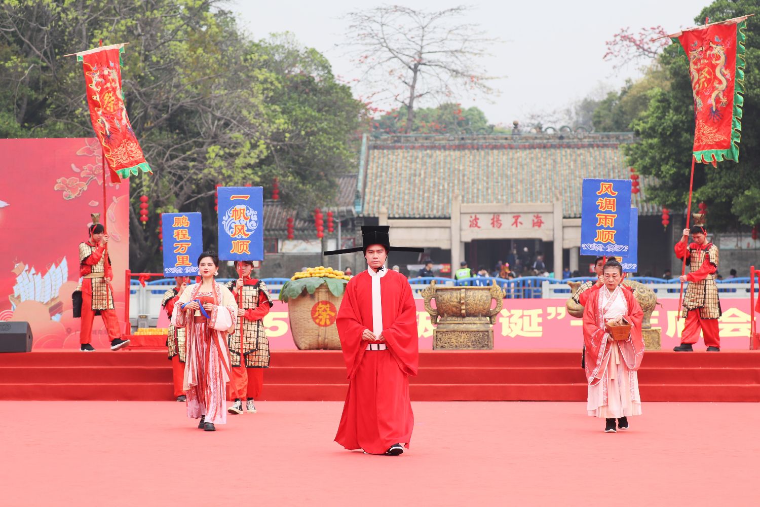 活动现场,身着宋代文官服饰的主祭官,手持的木质笏板是古代官员面圣的礼器,象征对神明的敬畏,绕行祭品,敬献海陆之珍,以宋代古礼祈福。(图片来源:广东南方网)