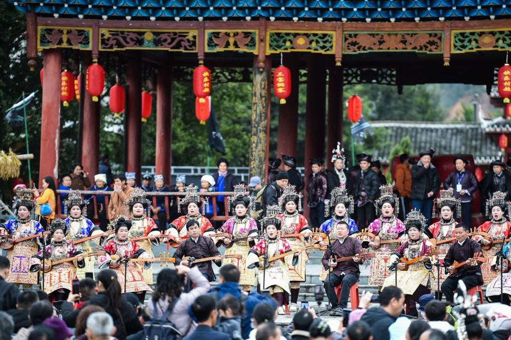 在贵州省榕江县三宝侗寨,参加“萨玛节”活动的民众在弹唱侗族琵琶歌。