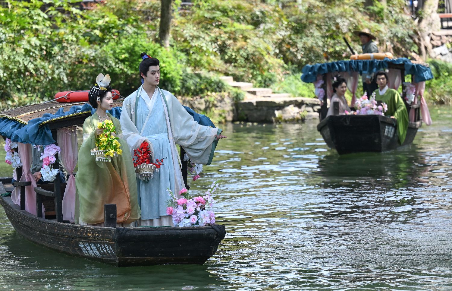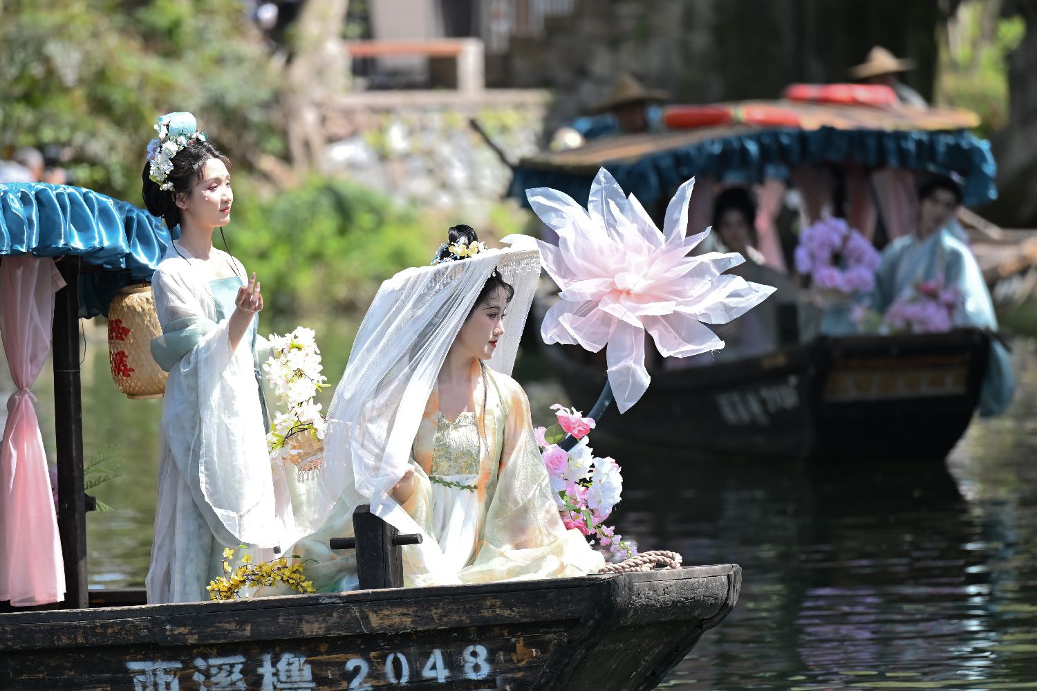 24日,“花神”泛舟西溪河道。(图片来源:中新社)