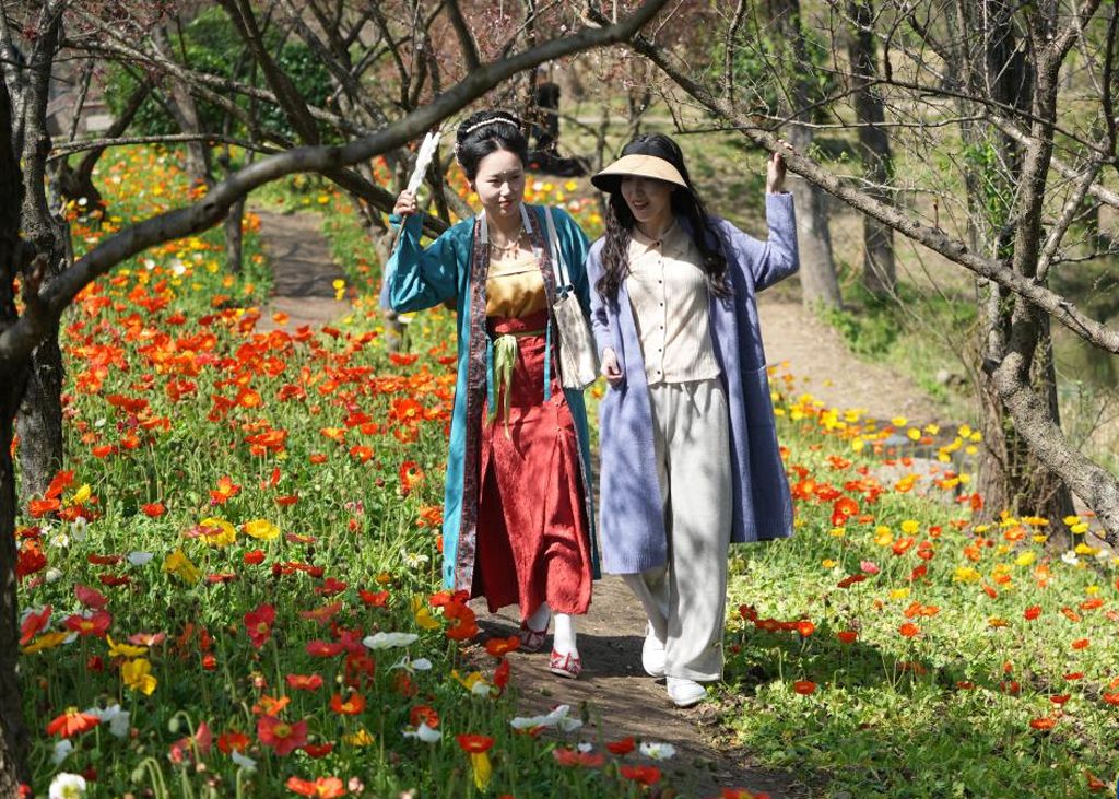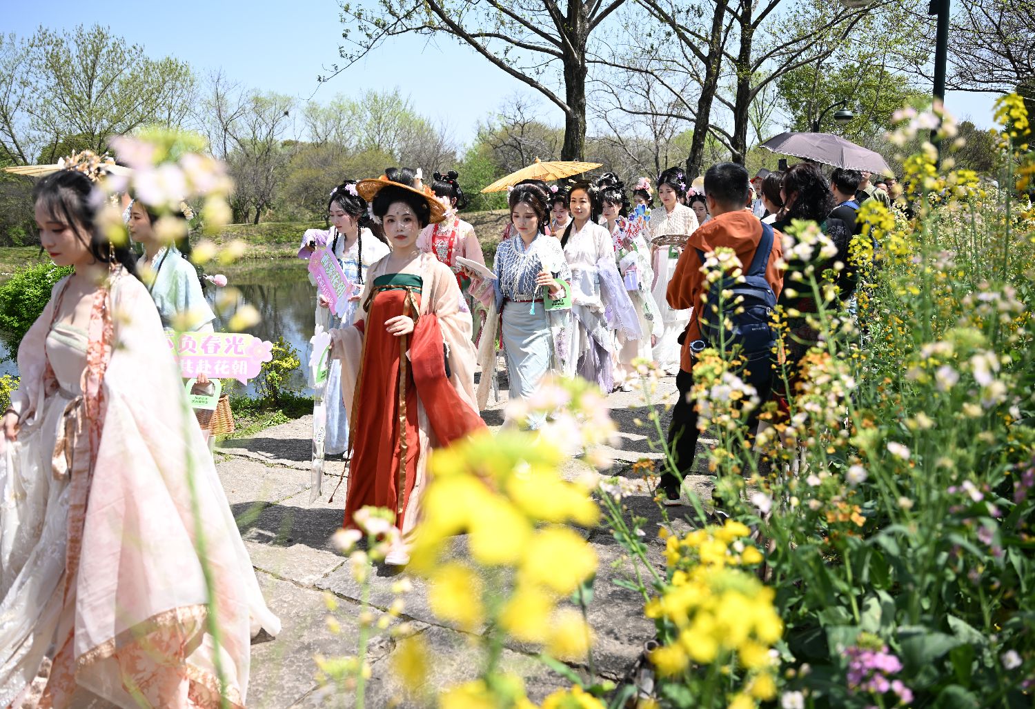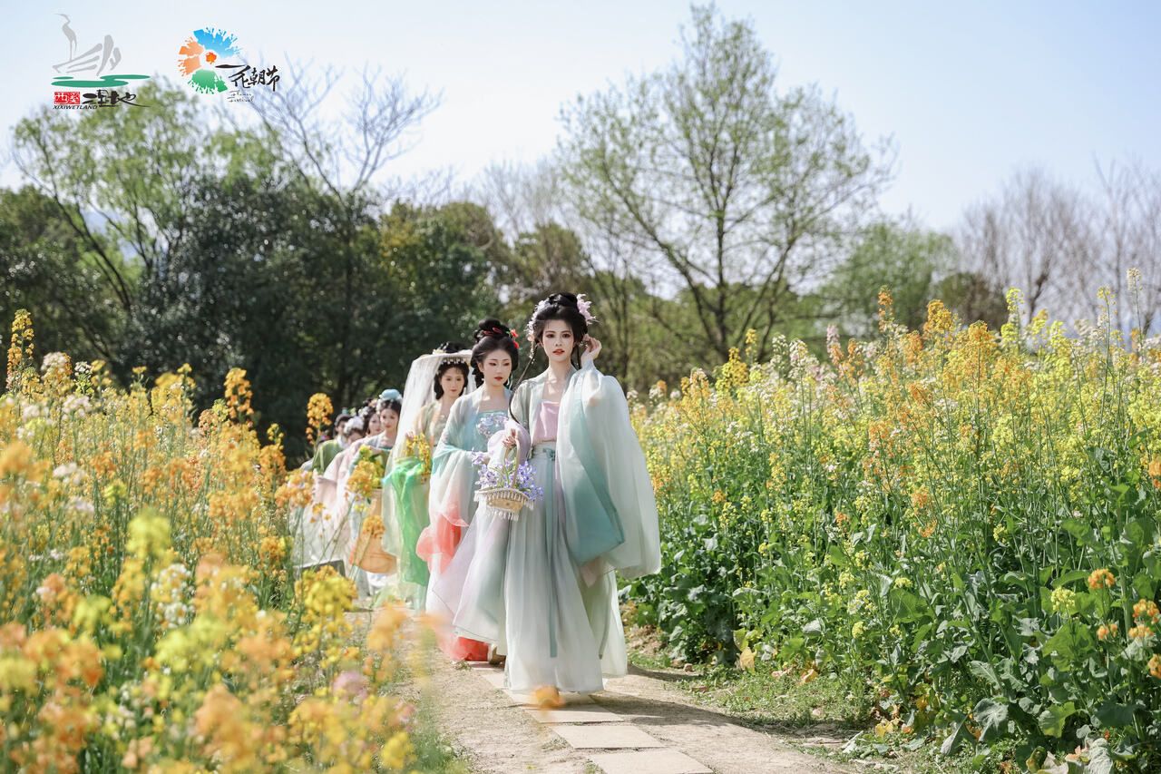 据了解,目前西溪湿地内虞美人、雪柳、樱花、垂丝海棠、五彩油菜花等花卉已经开放,到了4月份,还有牡丹、芍药、杜鹃等各类名花争奇斗艳。图为“花神”24日在花田前巡游。(图片来源:中新社)