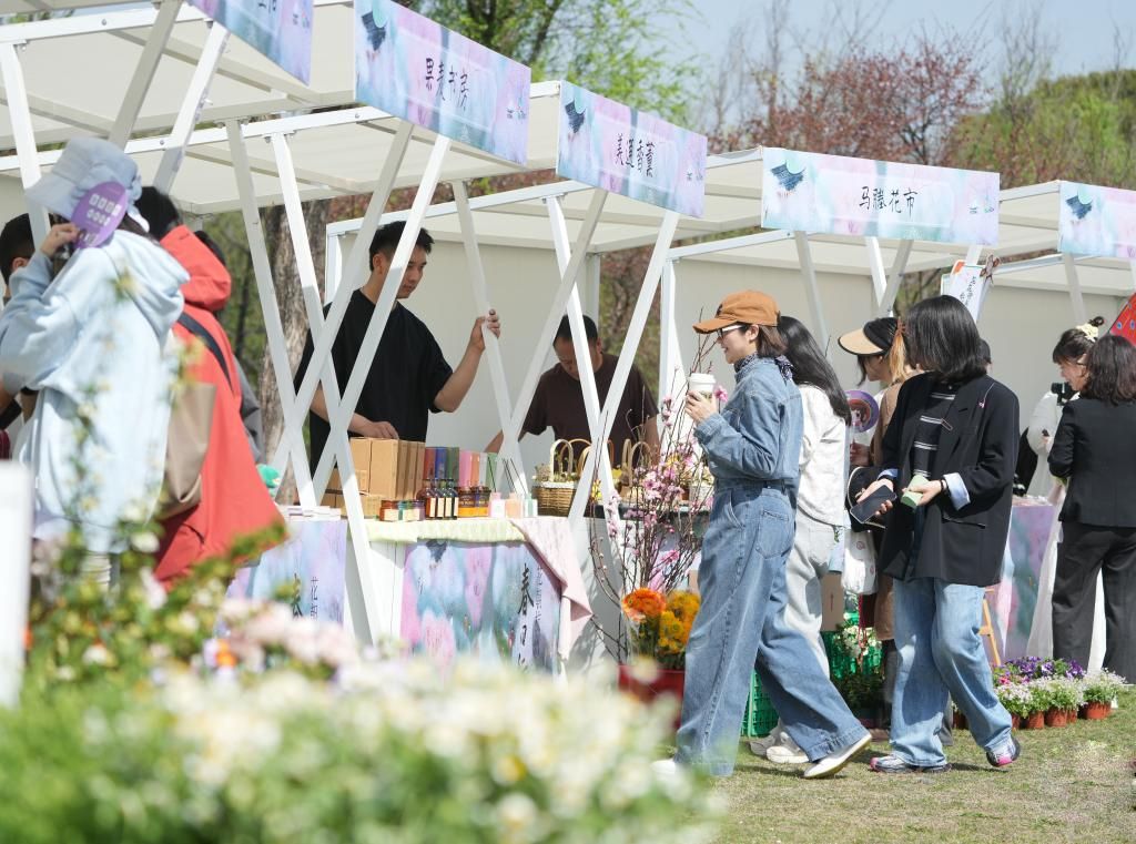 游客24日在西溪湿地“花朝市集”上闲逛。(图片来源:新华社)