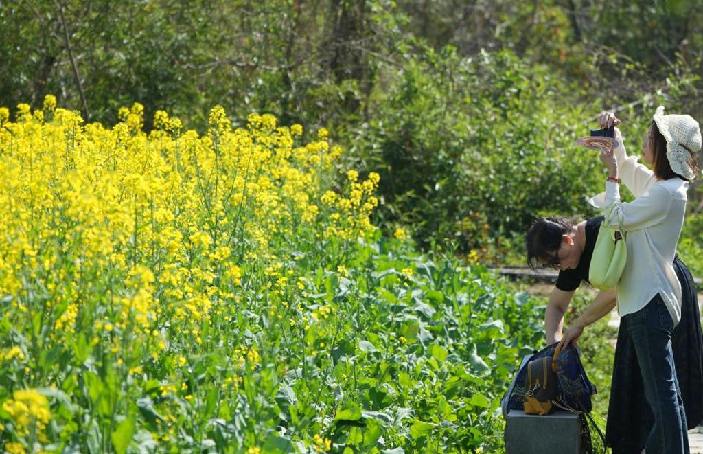 游客24日在西溪湿地一片油菜花旁拍照。(图片来源:新华社)