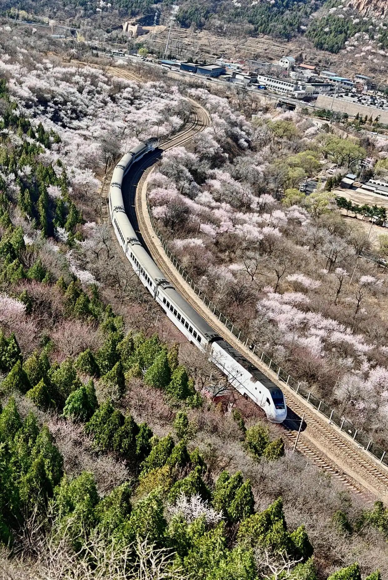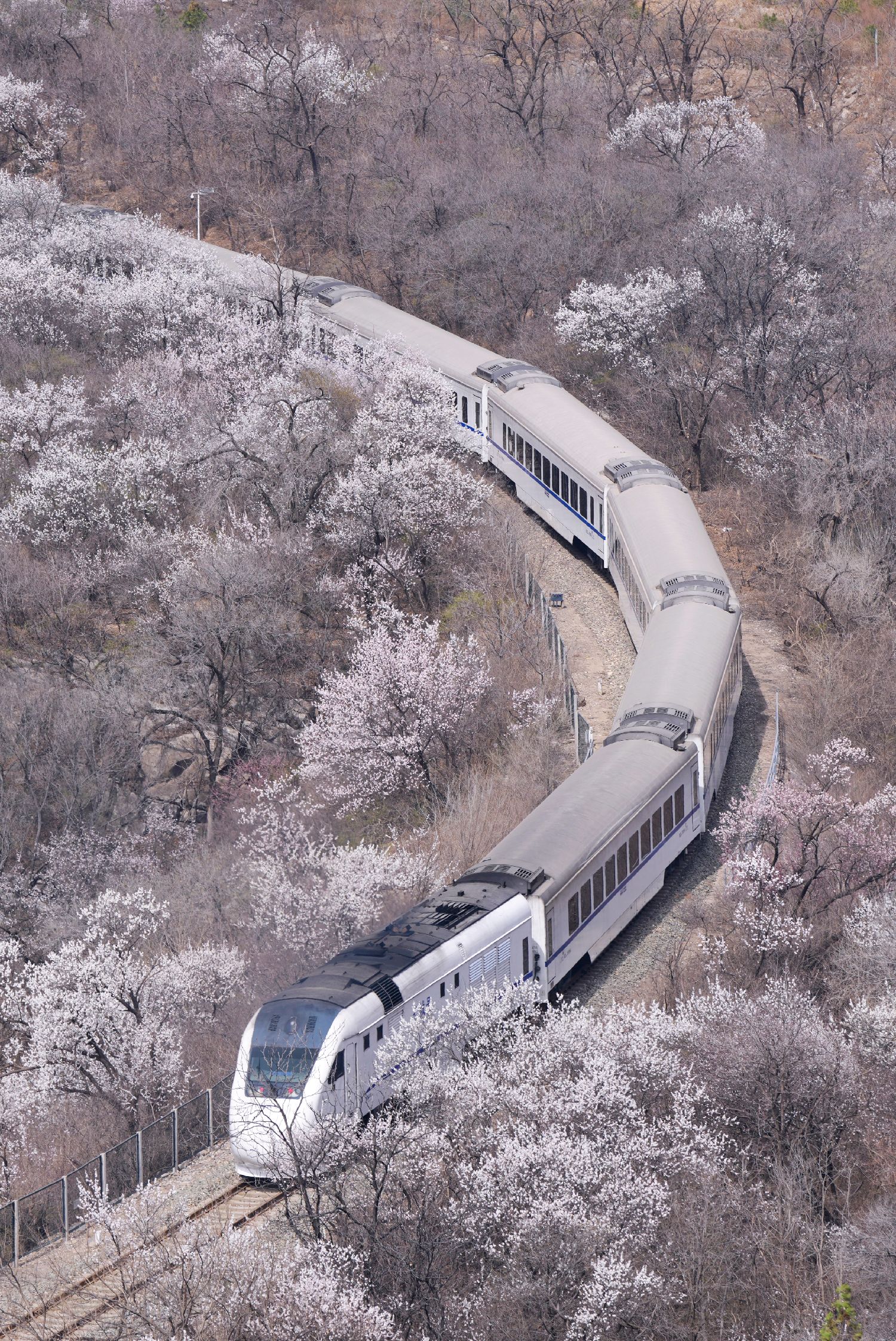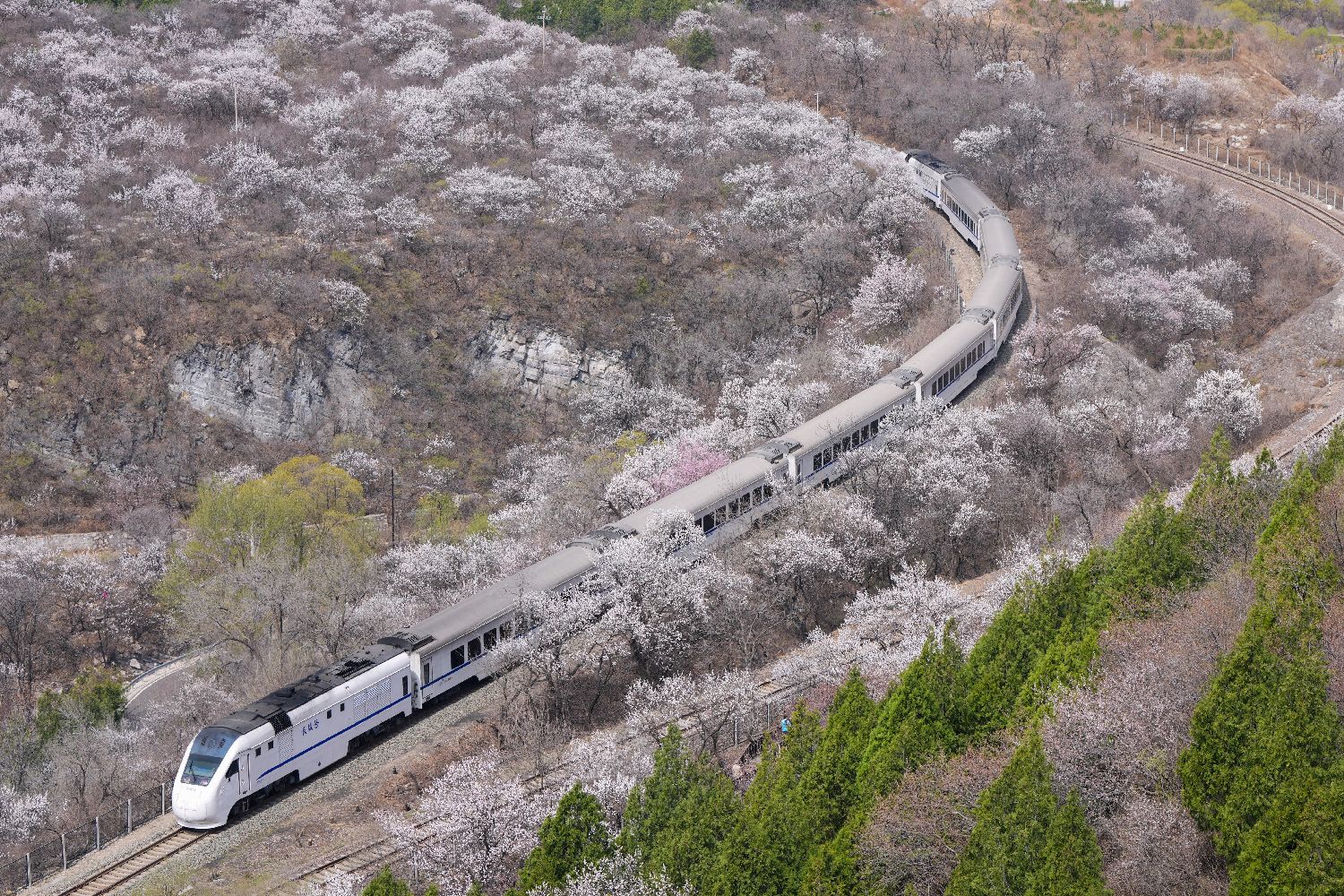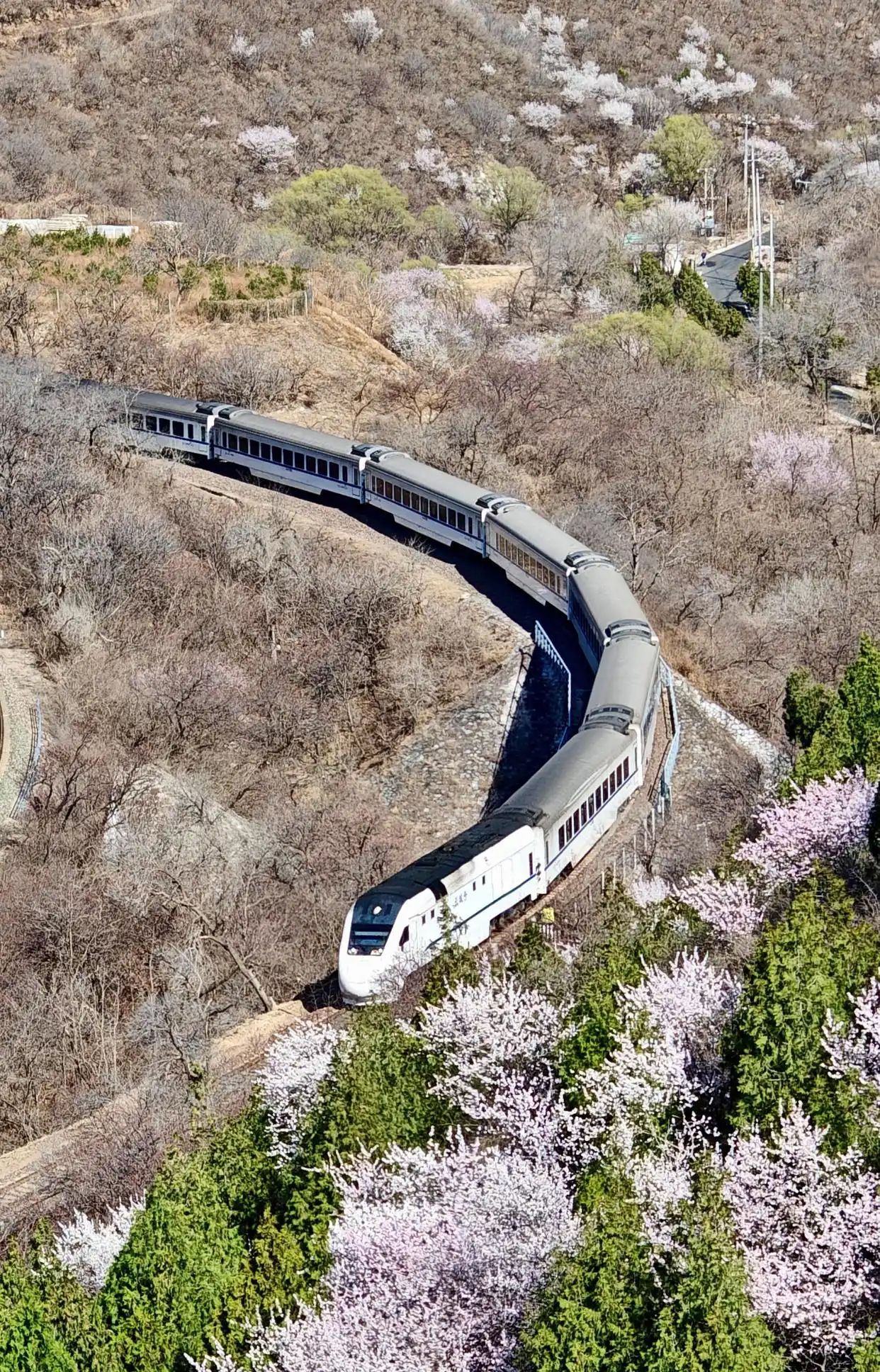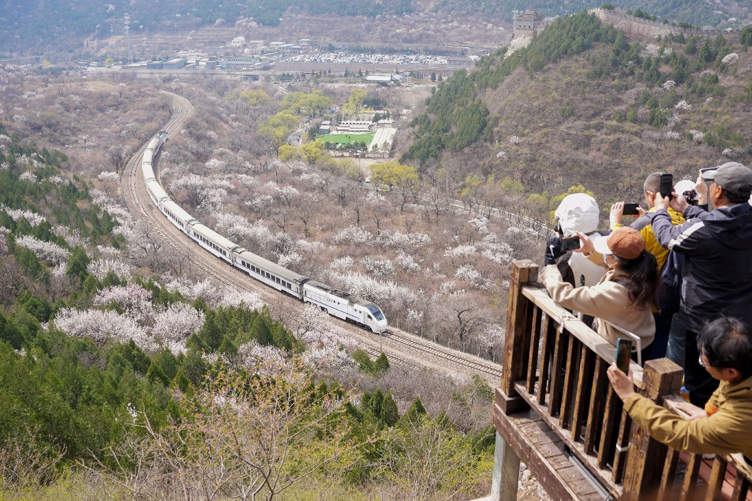 近日,北京居庸关长城脚下的山花渐次开放。北京市郊铁路S2线列车穿行于花海间,成为春日里一道美丽的风景,吸引不少游人前来赏春。