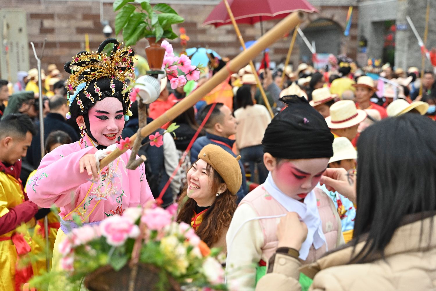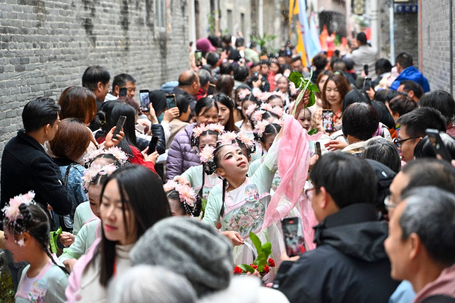 “福满人间”净瓶方阵的小演员向市民游客传递祝福。(图片来源:中新社)