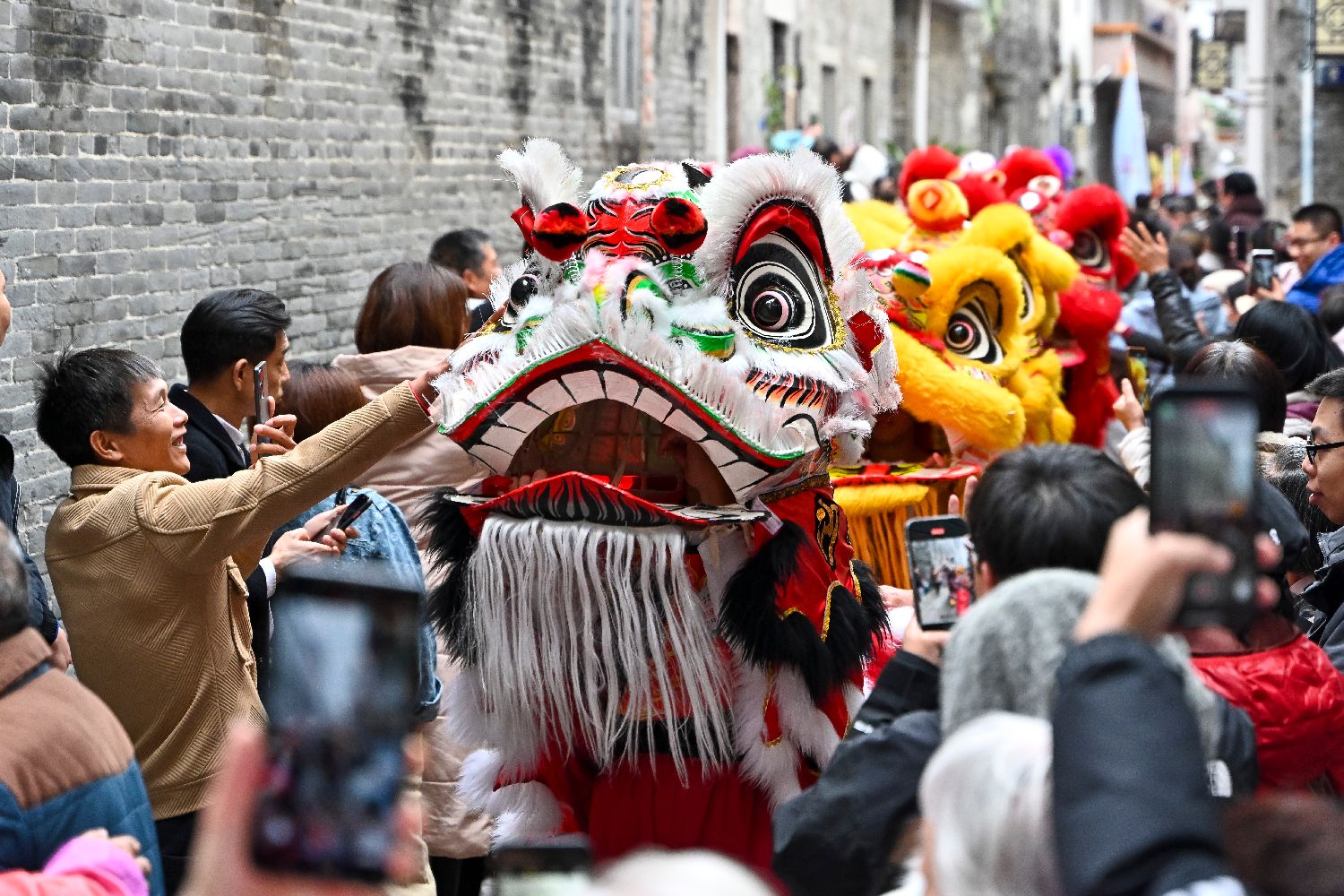 醒狮向市民游客传递祝福。(图片来源:中新社)