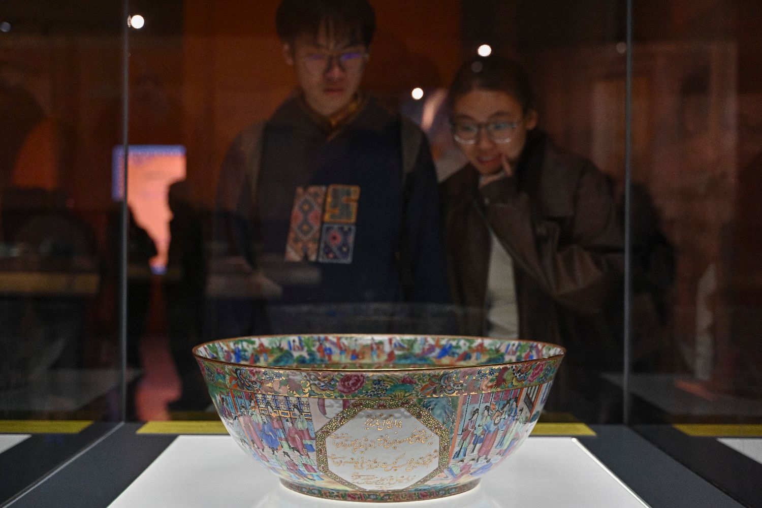 广东省博物馆“群星点亮的夜空——波斯文化艺术瑰宝展”中的广彩波斯文铭文人物故事图大碗吸引观众。(图片来源:中新社)