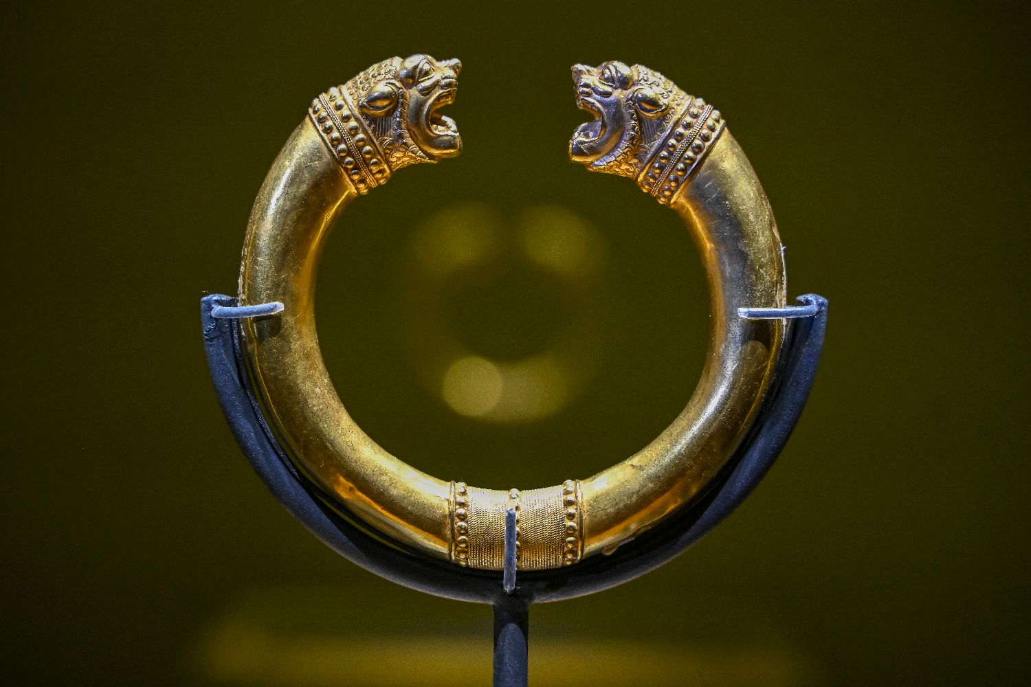 4月1日,广东省博物馆“群星点亮的夜空——波斯文化艺术瑰宝展”中的黄金狮首授权环。(图片来源:中新社)