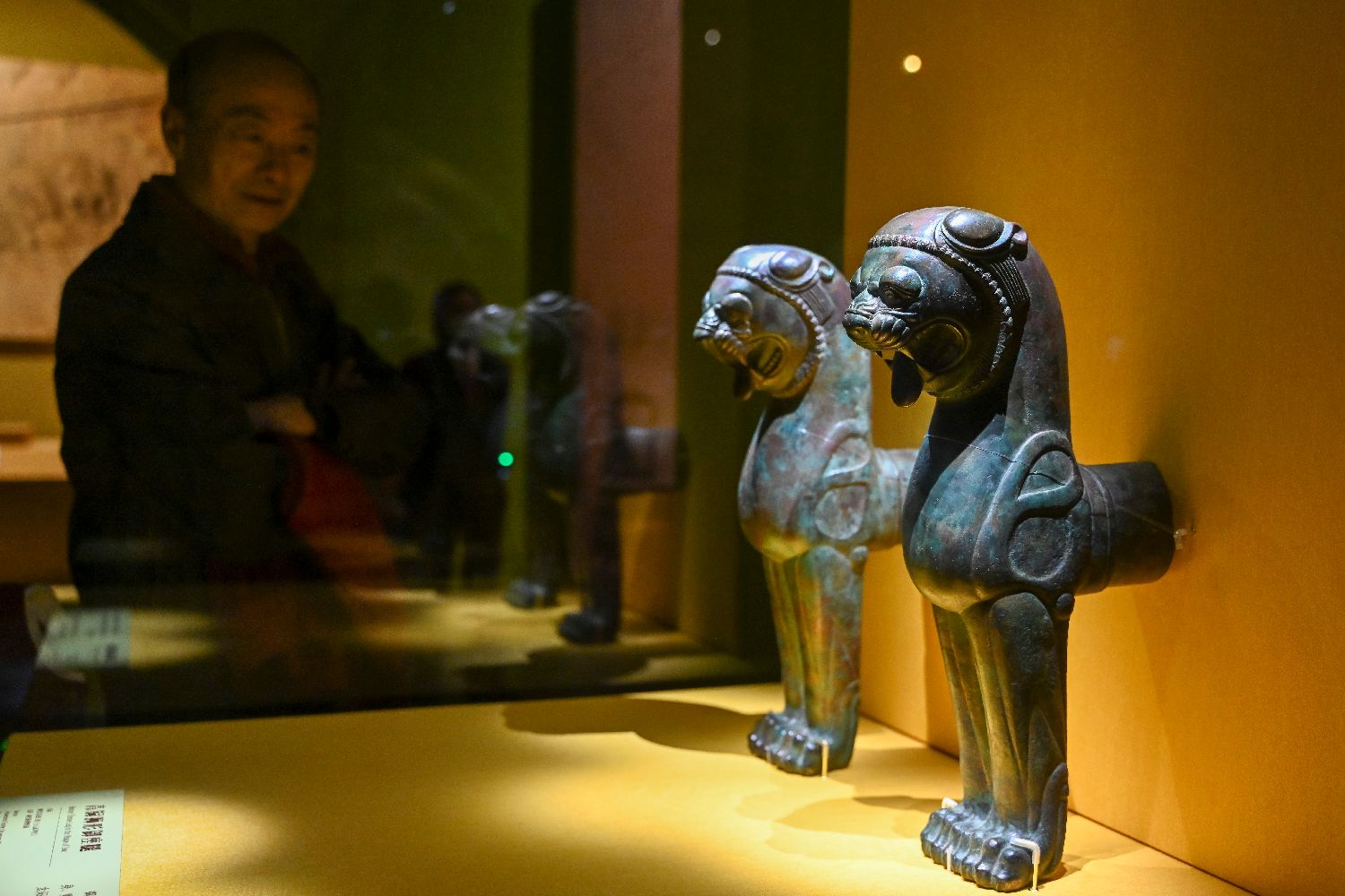 4月1日,广东省博物馆“群星点亮的夜空——波斯文化艺术瑰宝展”中的青铜狮形御座腿吸引观众。(图片来源:中新社)