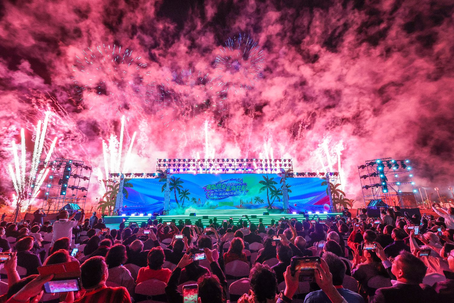 活动包括开幕式、侨商共建自贸港——走进文昌招商推介会、“青年文昌”座谈会、世界海南乡团联谊会第十七届理事会第四次会议、南洋企业家经贸交流圆桌会议等内容。图为开幕式现场的烟花秀表演。