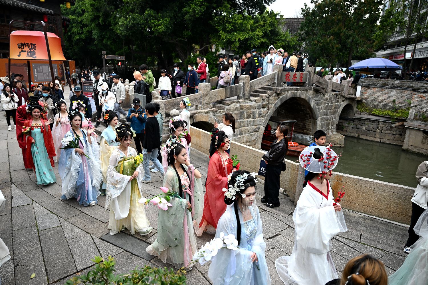 身穿汉服的女子扮演的“十二花神”在上下杭历史文化街区巡游。