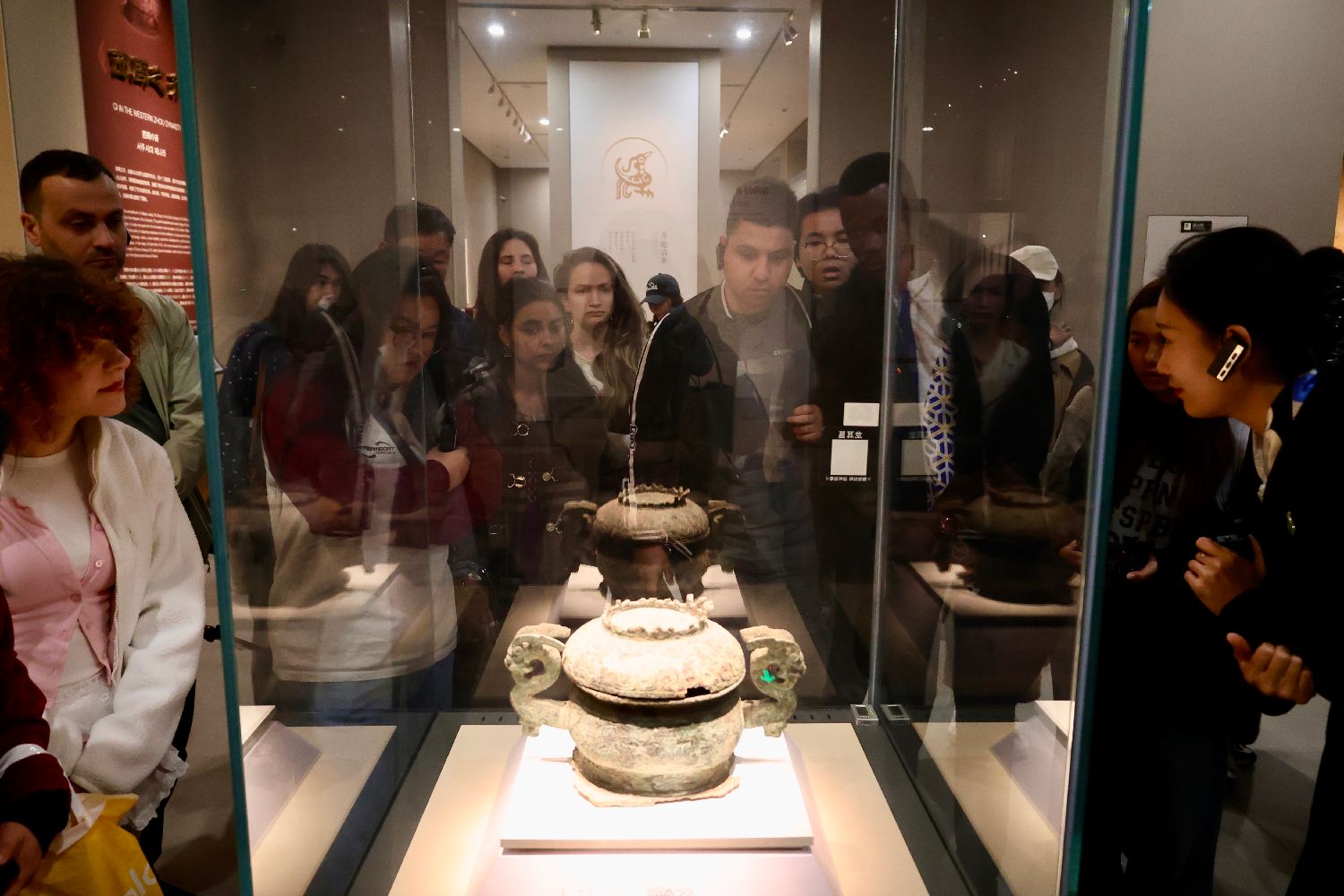 外籍留学生在齐文化博物馆参观龙耳簋。
