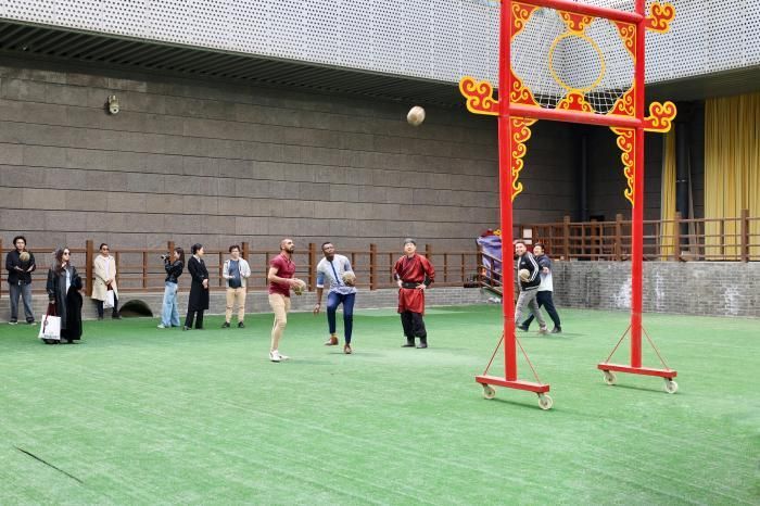 外籍留学生在临淄足球博物馆体验蹴鞠。