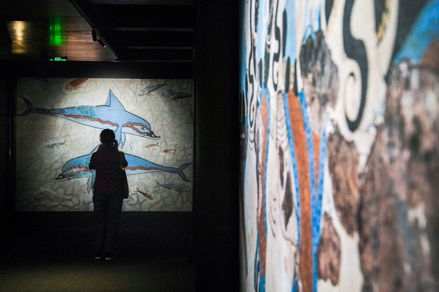 “代达罗斯:希腊克里特岛的神话”特展在北京故宫博物院开幕。图为海豚壁画吸引参观者。(图片来源:中新社)