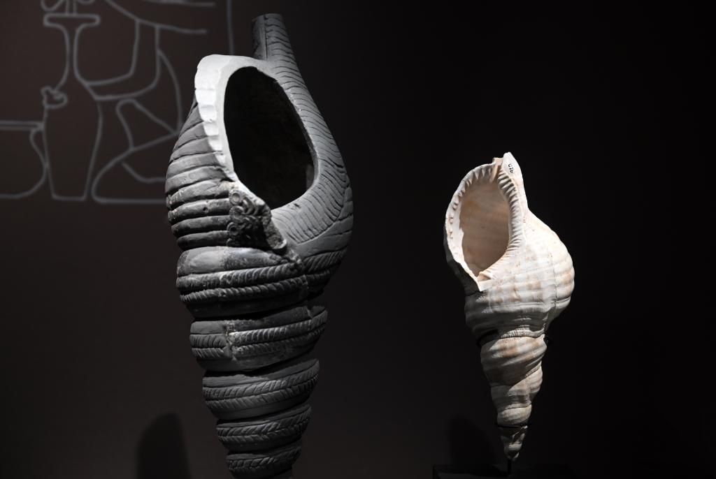 展厅结尾特别增设“海月同辉”篇章,展出故宫博物院藏中国新石器时代晚期至商周时期的13件重要文物,同台展示人类早期文明的多元性与共通性。(图片来源:大陆央视新闻客户端)