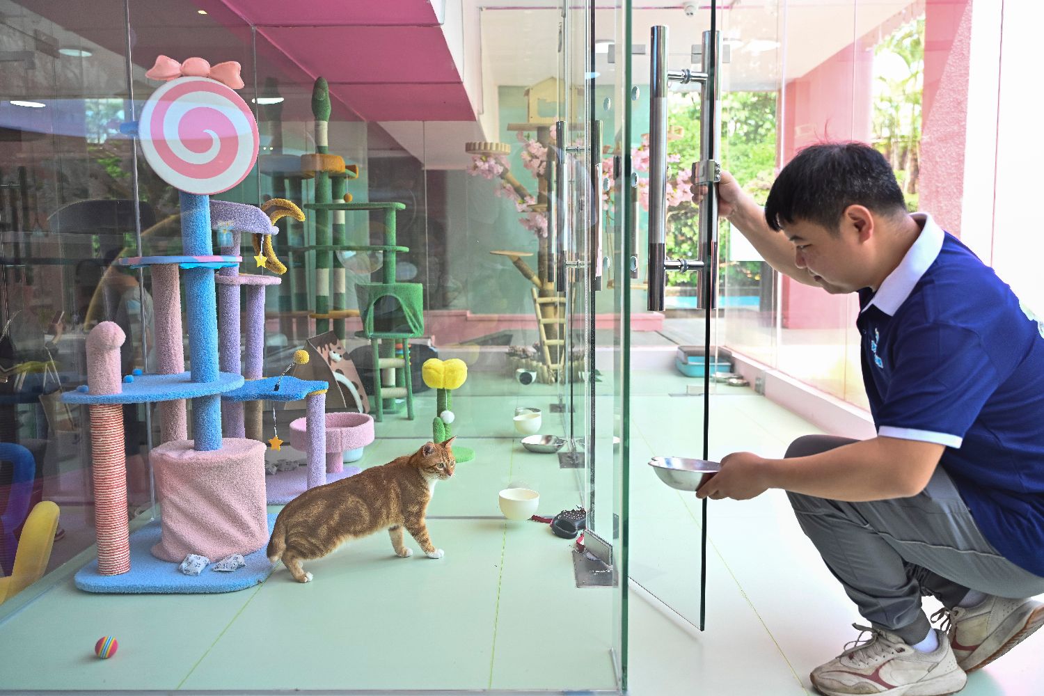 为满足长途出行旅客的宠物寄养需求,宠物航站楼(一期)内配置6大主题阳光猫房、4大独立狗房和7间智能宠物仓,主题房型设计融合宠物行为学,如猫所需的垂直空间、狗的社交空间需求等,首次开放的宠物酒店可以同时容纳17-30只宠物。图为宠物航站楼内的“宠物酒店”。(图片来源:中新社)
