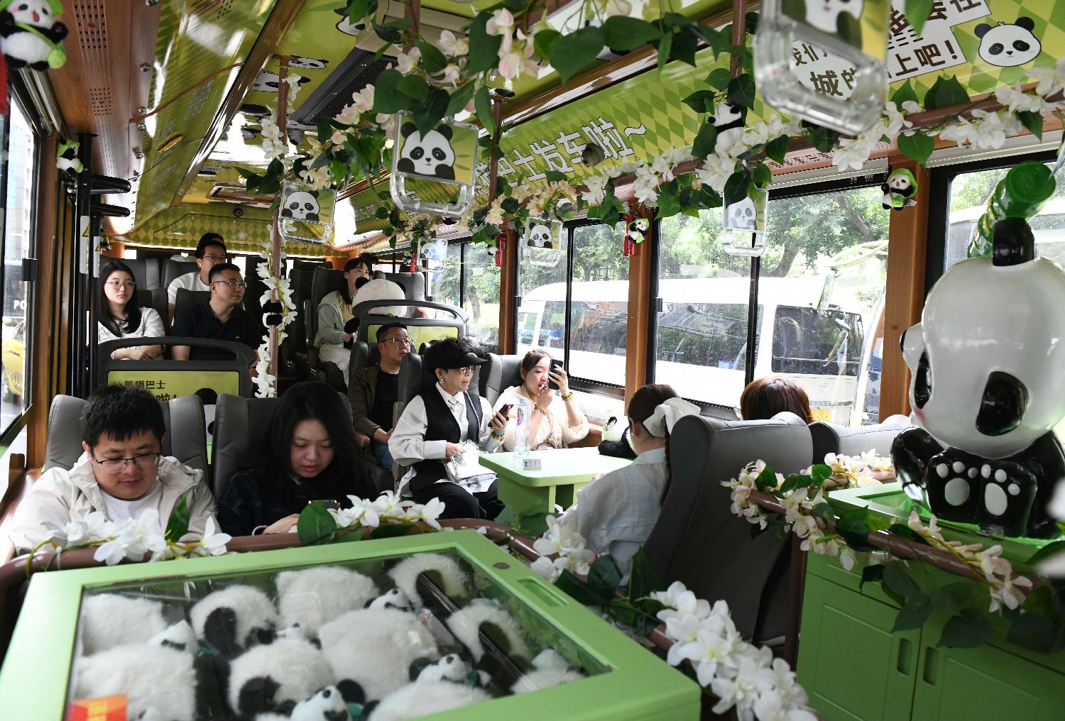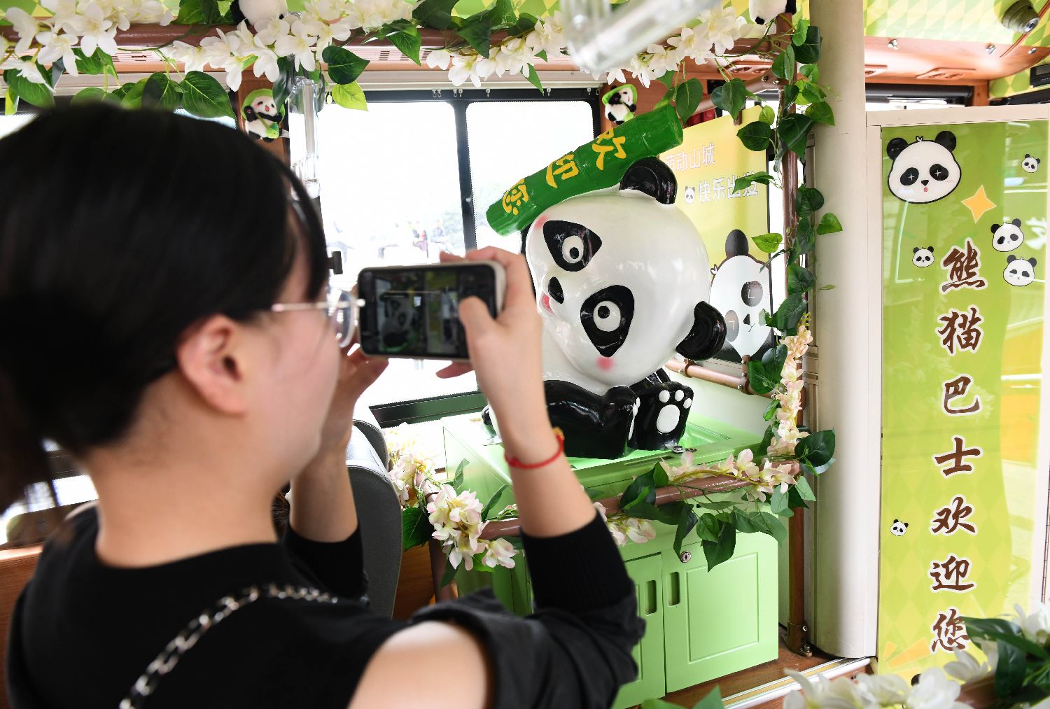 乘客拍摄熊猫巴士内的熊猫造型装饰。(图片来源:中新社)