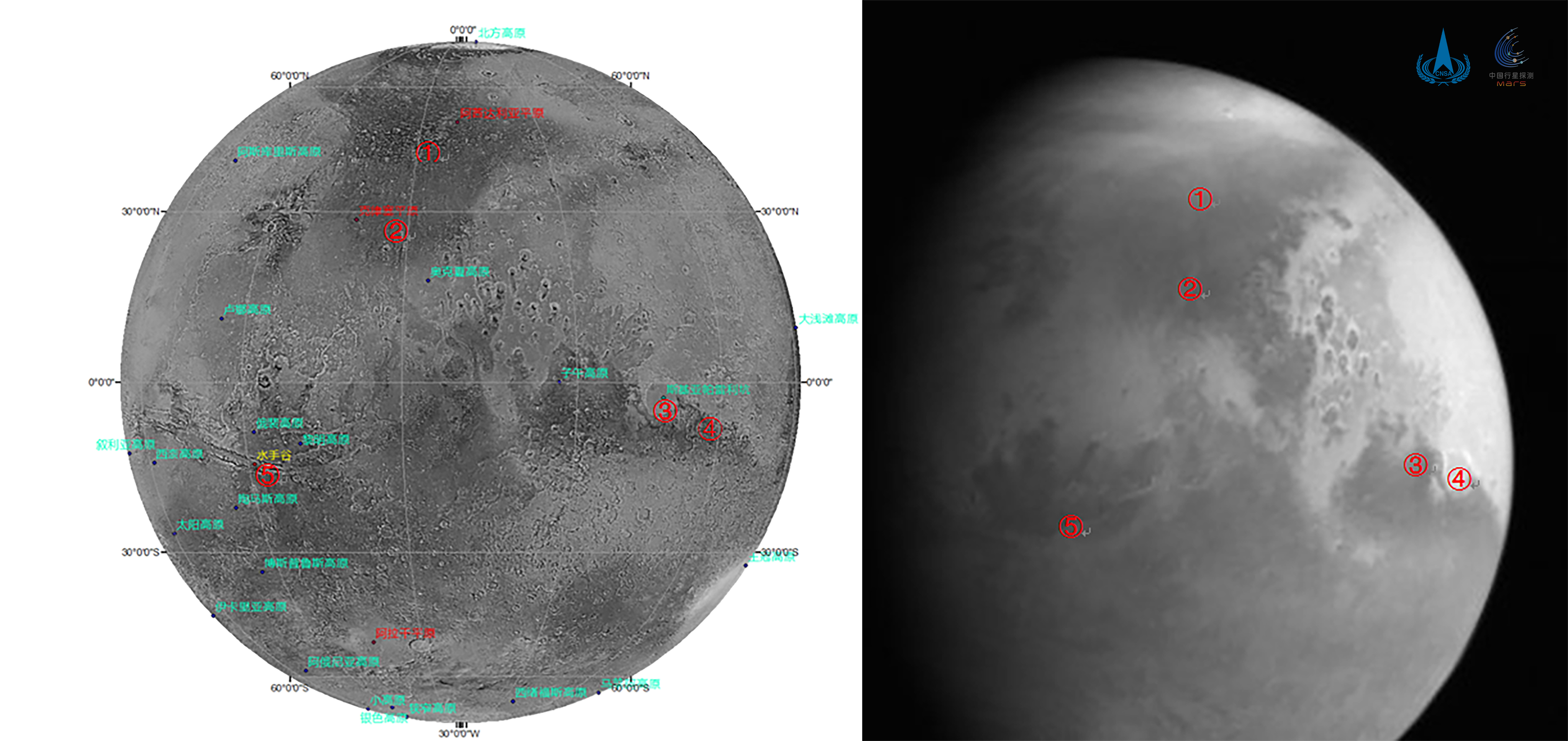 图为天问一号拍摄的首幅火星图像。①阿茜达利亚平原;②克律塞平原;③子午高原;④斯基亚帕雷利坑;⑤水手谷。(图片来源:中国国家航天局/中新社)