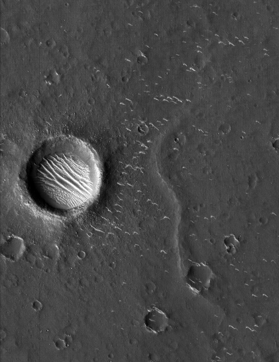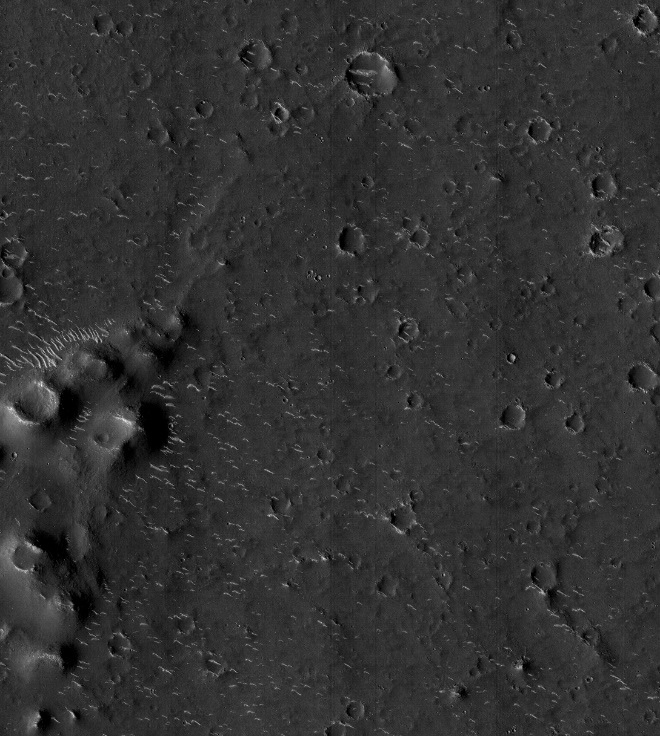 图为全色图像,成像区域内火星表面小型环形坑、山脊、沙丘等地貌清晰可见。(图片来源:中国国家航天局/中新社)
