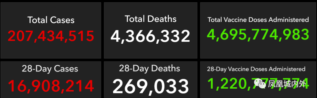 据约翰‧霍普金斯大学的统计数据,截至周一上午8:21,新冠病毒已感染了192个国家和地区的超过207,348,828人,导致至少4,365,505人死亡。