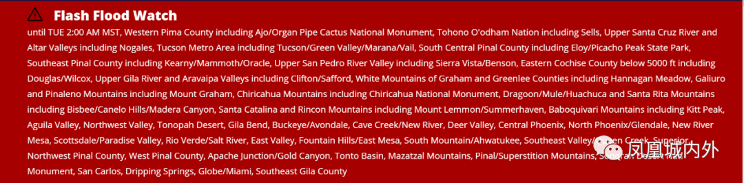 国家气象局表示,截止至周二凌晨2点,亚利桑那州以下地区有山洪爆发危险:
