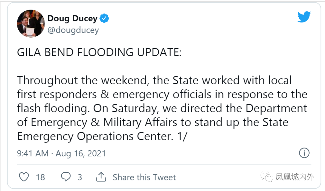 “整个周末,(亚利桑那)州都与当地急救人员和紧急情况官员合作应对山洪暴发。周六,我们指示紧急事务和军事事务部建立州紧急行动中心,”杜西在一条推文中说。