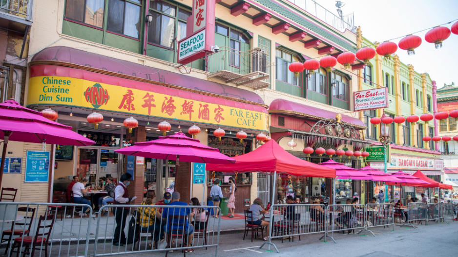 顾客在旧金山唐人街街头用餐。(图片来源:中新社资料图)