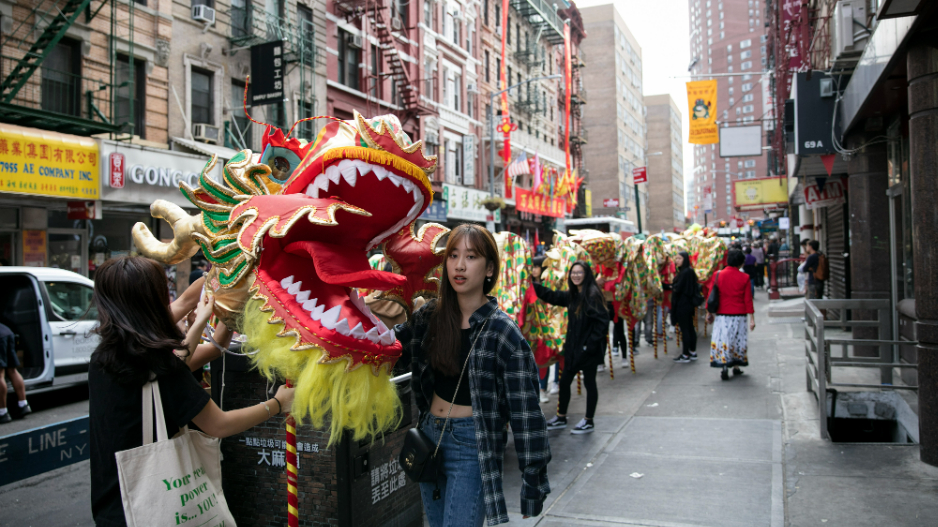 纽约华人青年在曼哈顿唐人街准备舞龙道具参加庆祝“中国日”(CHINA DAY)活动。(图片来源:中新社资料图)