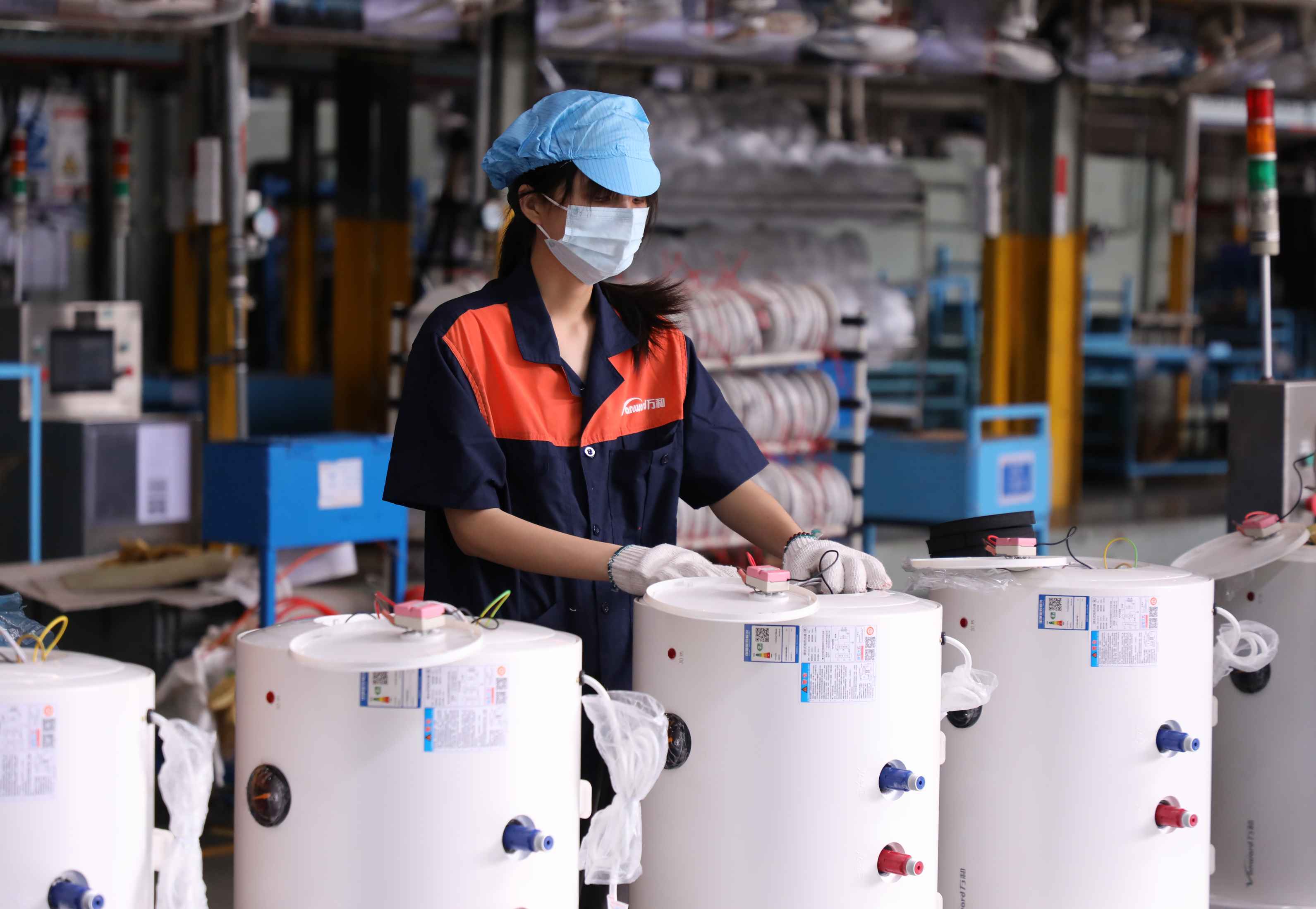 图为9月30日,广东万和电气员工在电热水器生产线工作。(图片来源:新华社)