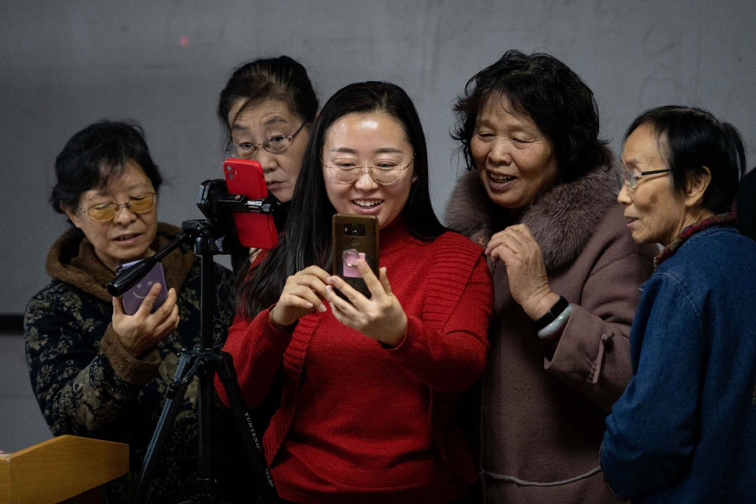 图为太原老年开放大学教师杨晓琴(中)在“智能手机课”上教老年人使用手机上网。(图片来源:中新社资料图)