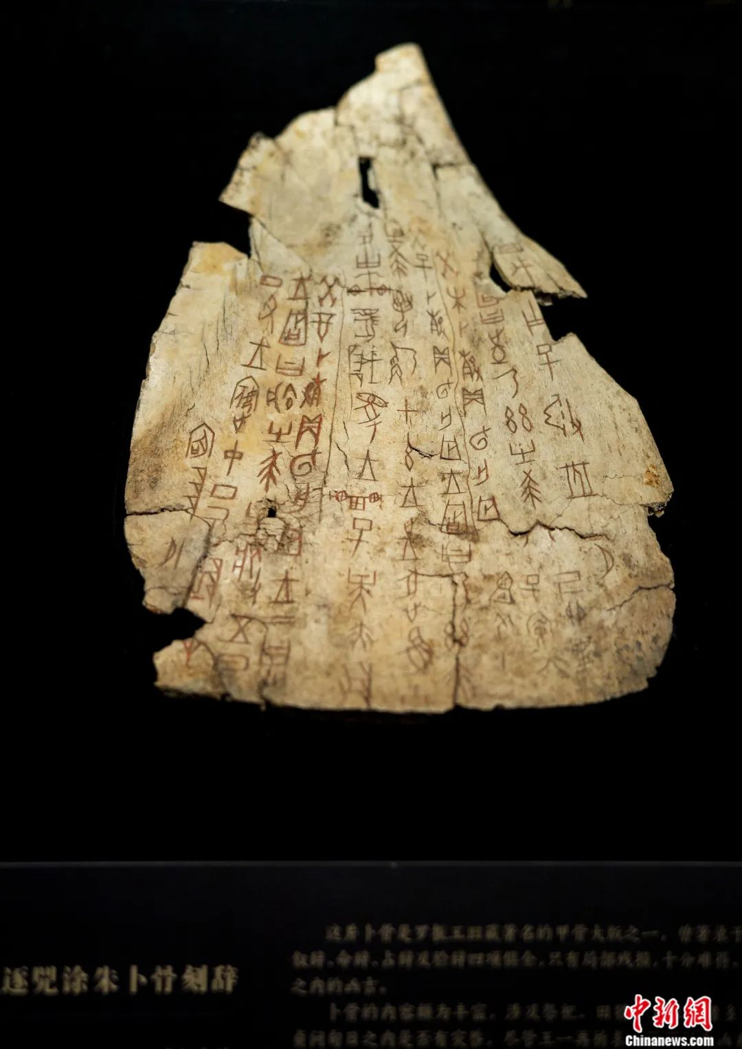 位于北京的国家博物馆内的“证古泽今——甲骨文文化展”展出的“王宾中丁·王往逐兕涂朱卜骨刻辞”卜骨。(图片来源:中新网)