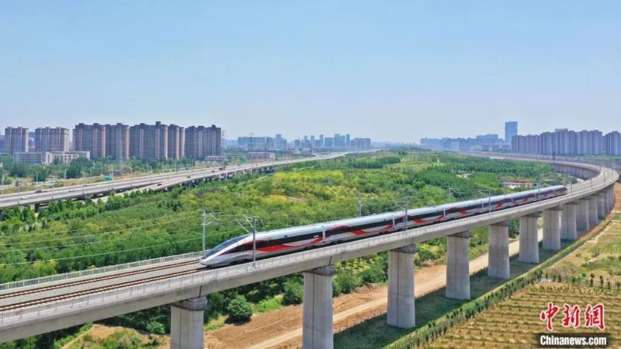 一列高铁驶过郑州城区。(图片来源:中国国铁集团郑州局/中新网)