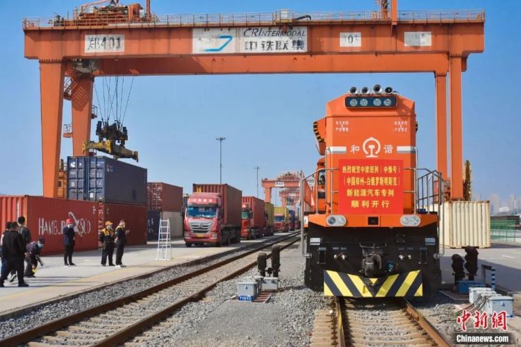 中欧班列(中豫号)满载新能源汽车待发车。(图片来源:河南中豫国际港务集团/中新网)