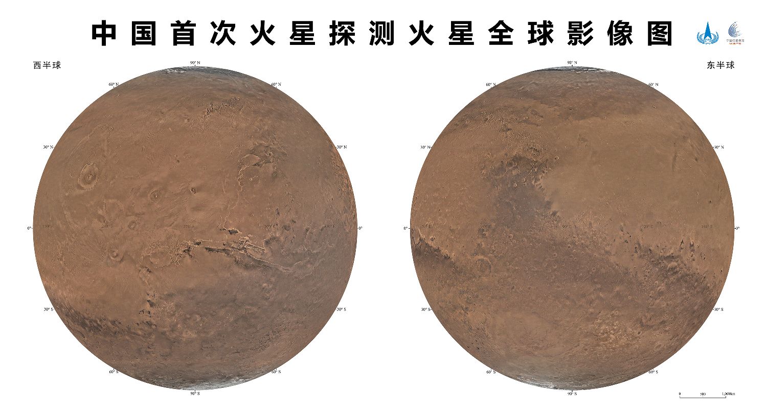 图为24日发布的火星东西半球正射投影图。(图片来源:新华社)