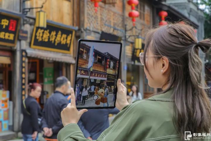 ▲工作人员将平板电脑摄像头对准三坊七巷内任意一个特征明显的建筑,就能进入元宇宙。原浩/摄