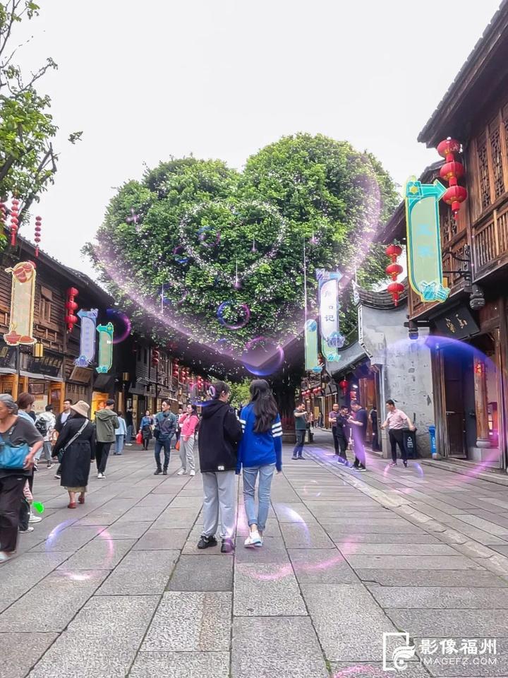 ▲南后街上的网红“爱心树”,撒落一树粉色爱心。原浩/摄