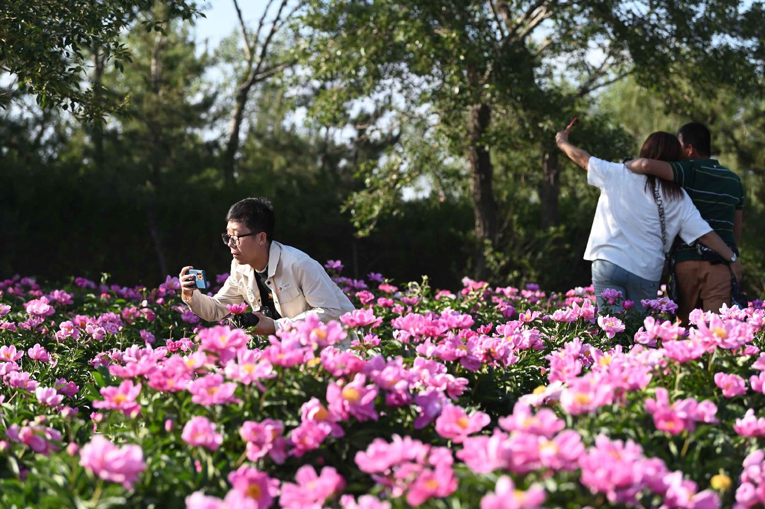 6月2日,2023年内蒙古和林格尔第十四届芍药文化旅游节在内蒙古呼和浩特市和林格尔县南山旅游景区开幕。图为游客在芍药园中游玩。(图片来源:中新社)